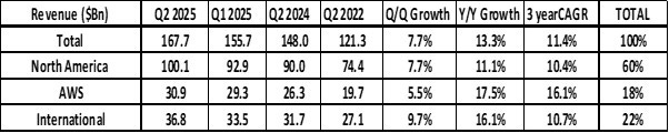 AWS and the International segment saw above average revenue growth. North America revenue growth at 11.1% (y/y) was below average but North America continues to be dominant, accounting for 60% of the revenue.