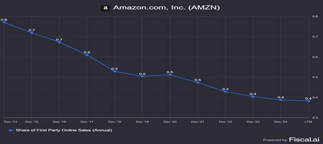 In a scenario of strong overall growth, the share of revenue accounted by first party online sales has consistently fallen in the last decade from about 75% in December 2014 to about 37% currently.