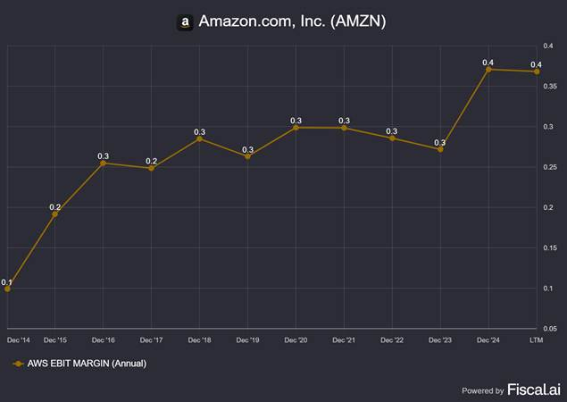 AWS has much higher operating margins than all other segments (except perhaps Advertising) and these have been on a rising trend for a decade. (See chart below).