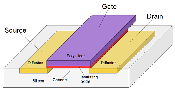 The diagram above illustrates different chip architectures. Each has a source and a drain which are separated by the gate. When the power is at the right voltage, the gate opens and allows a flow of electrons to go from the source to the drain