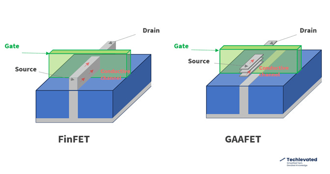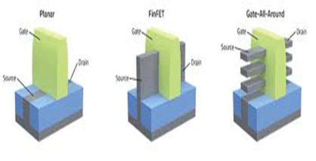 GAA takes the FinFET design and turns it sideways so that the channels are horizontal instead of vertical. Instead of surrounding the channel on three sides as in the FinFET architecture, GAA surrounds it on all four sides, to allow better control of the transistor switch.