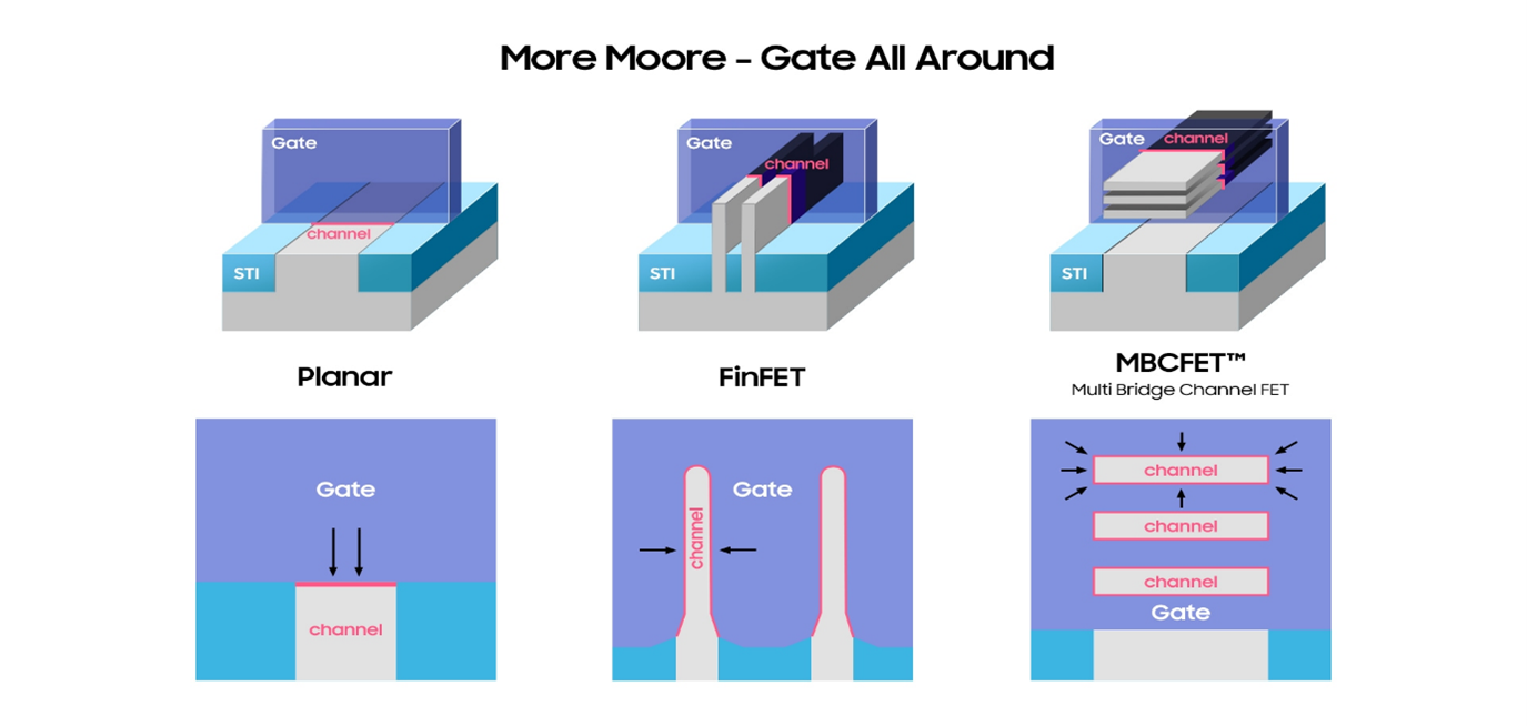 Now Samsung, Intel and other are moving to the Gate-all-Around (GAA)architecture. This informative video gives some good information on GAA.