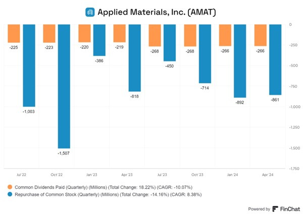 AMAT distributed nearly $1.1bn to shareholders, including $266 million in dividends and $820 million in buybacks.