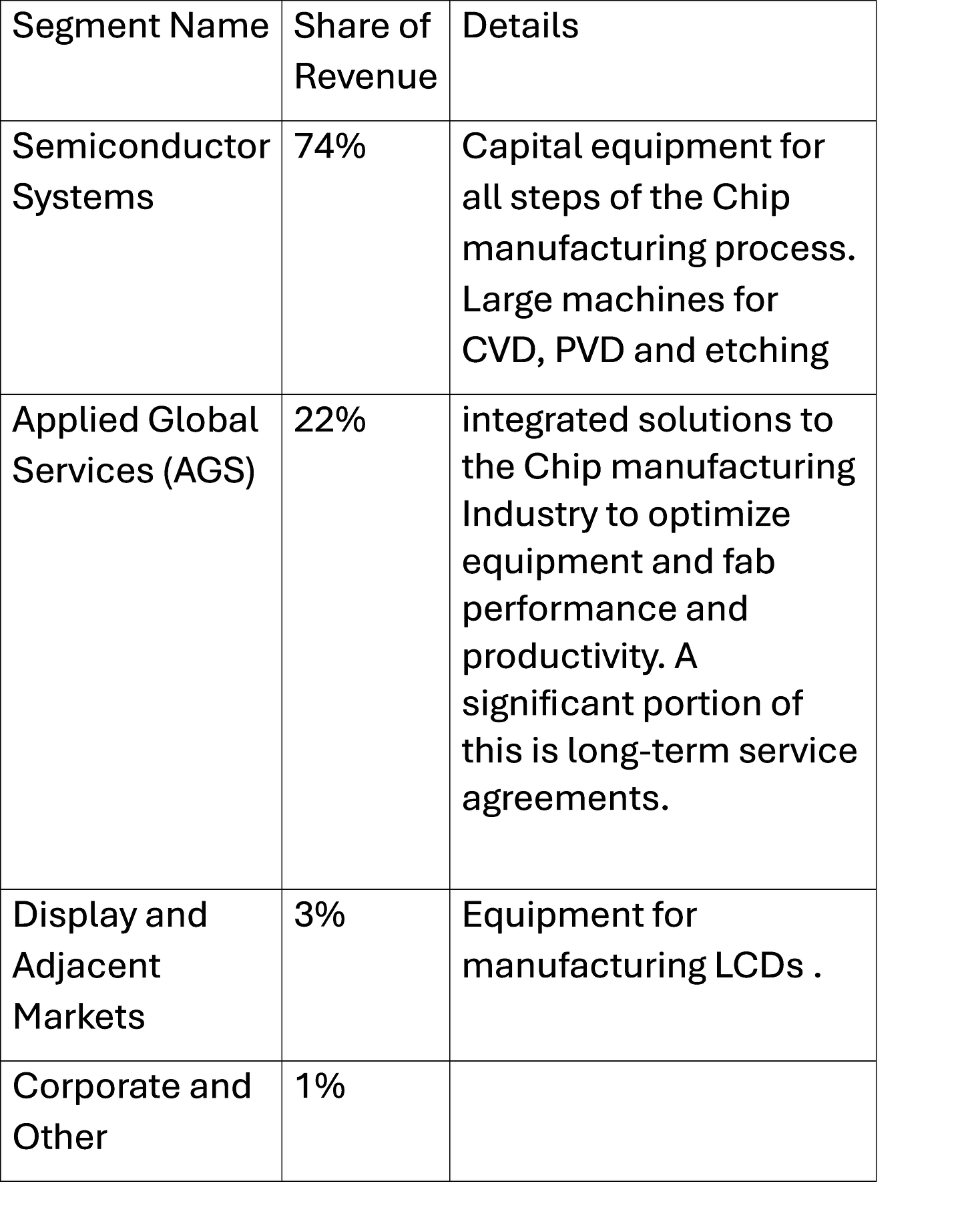 AMAT’s customers are manufacturers of chips which go into items such as computers, phones liquid crystal displays (LCD)/photovoltaic cells and which, they sell to manufacturers of advanced electronic components and products. Most of AMAT’s sales are to integrated device manufacturers /foundries worldwide.