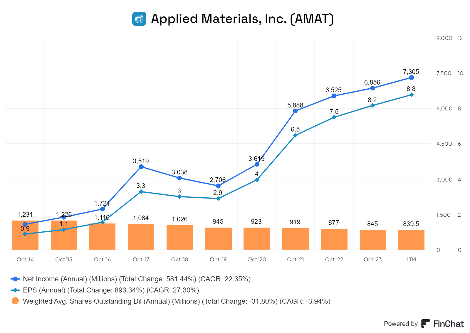 Net income and EPS have grown steadily over the last decade. Net income has grown at a CAGR of 22.4% while EPS has grown at abut 27.3% CAGR. The difference reflects the fact that AMAT has bought back shares and reduced shares outstanding by ~4.0 % CAGR over the last decade.
