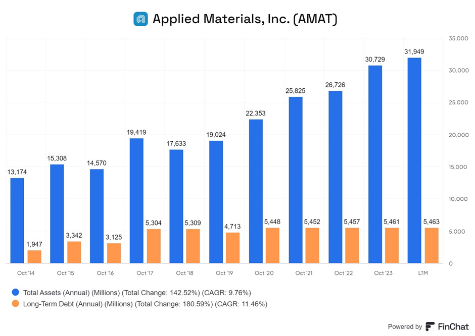 Applied Materials (AMAT) was incorporated in 1967 and listed in 1972. AMAT supplies manufacturing equipment, services & software to the global semiconductor, display, and related industries. Its early customers included Fairchild Semiconductor and Intel. In essence, they make and service machines which manufacture computer chips, flat panel TVs and solar devices.