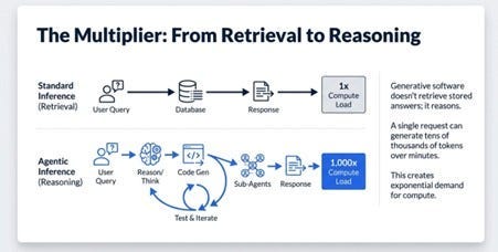 Agentic AI increases CPU core requirements by 4x (from 30 million to 120 million CPU cores per gigawatt) within existing power envelopes.