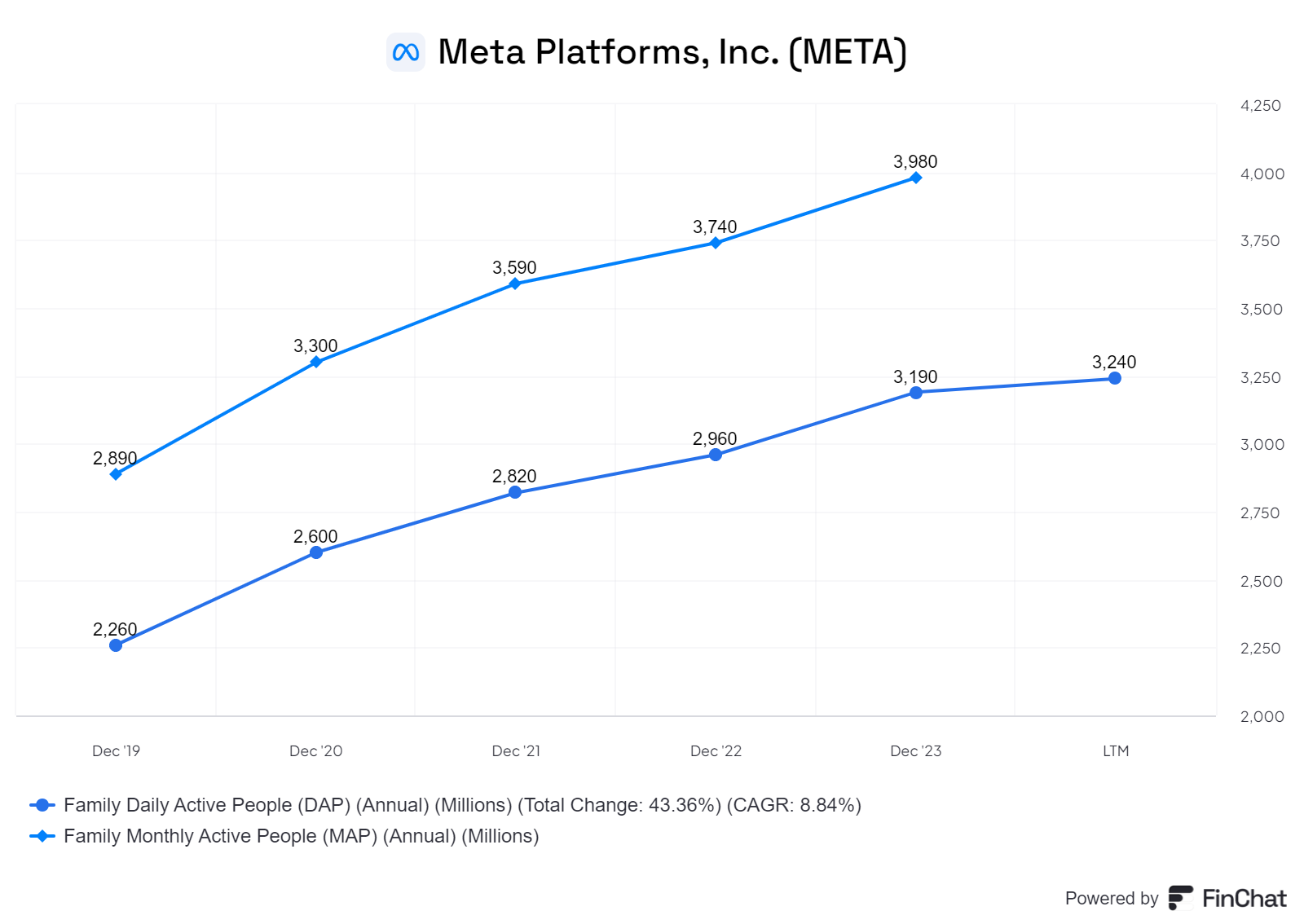 Meta no longer breaks down users for each app but for the whole FOA, the number of Daily Active Users (DAU) is 3.24bn people and annual revenue per user is about $44. Monthly Active Users (MAU) data will no longer be released but it was at 4bn at end 2023. This gives the approximate annual revenue run rate of $ 176bn (4bn x $44).