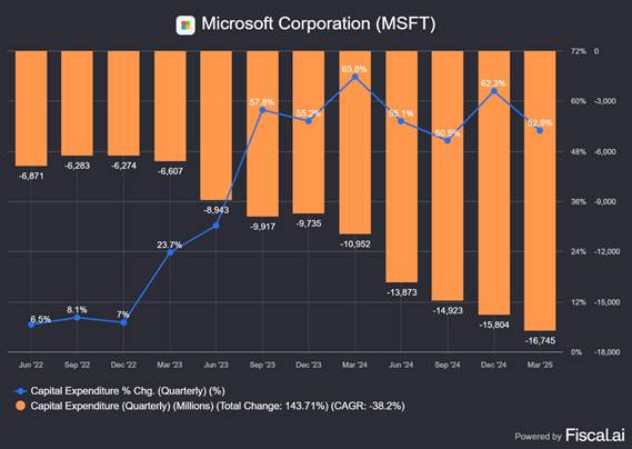 As with other large tech firms, capital expenditure is accelerating from already very high levels. The chart below shows MSFT’s quarterly capital expenditure. It has grown at a CAGR of 38%. It is shown as a negative bar as it is a cash outflow.