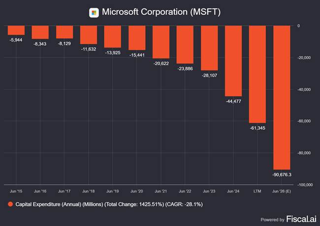 The chart below shows MSFT’s annual capital expenditure. It has grown at a CAGR of 28% in the last nine years and is expected to be $90bn (!) in FY 26. Again, it is shown as a negative bar as it is a cash outflow.
