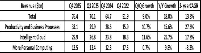 In Q4 2025, Intelligent Cloud was again the fastest growing while More Personal Computing was again the laggard.