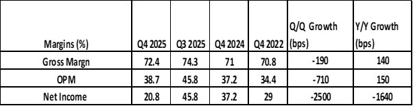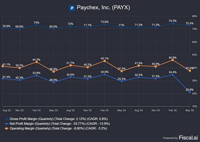 Margins have been stable over long periods. However, there was a notable decline in operating and Net Profit margins in Q4 2025. The decline in margins reflect the Paycor acquisition (see below).
