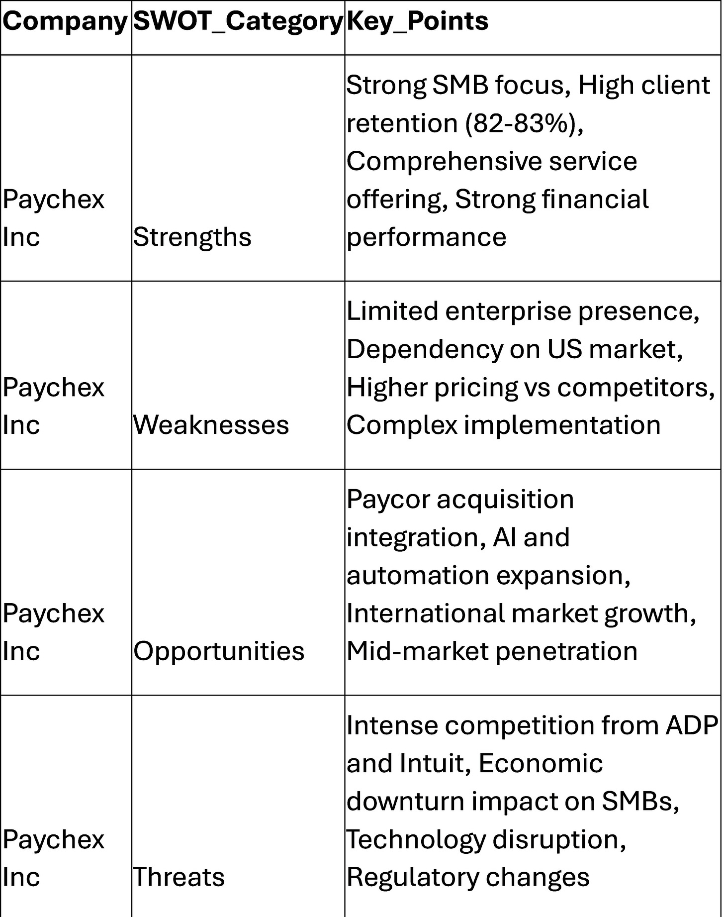 We asked an AI LLM to generate a SWOT analysis for PAYX. This was the output.