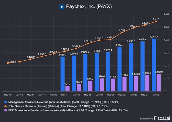 PEO and Insurance Solutions (24% of total revenue revenue) grew 15.6% CAGR over the last decade. The latter has been an important source of growth.