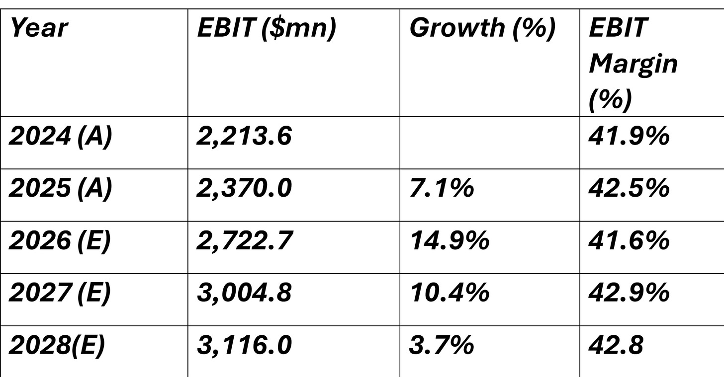 We also assume that FY 2029 EBIT margin will be 42.8%.