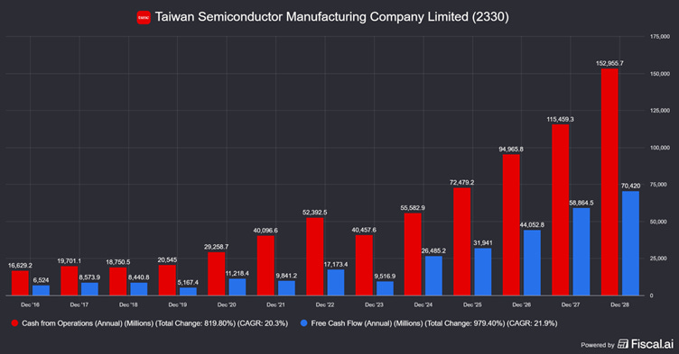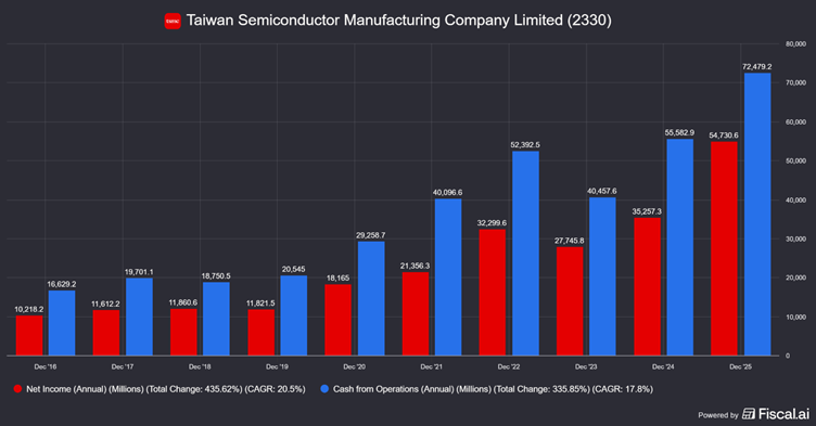 Revenue has grown at a CAGR of 17.1% in the last decade. In addition, as noted above, margins have also increased, significantly giving a double boost to TSMC. The impact of this can be seen in Net Profit and Operating Cash Flow growth. They have grown at a CAGR of 20.5% and 17.8% respectively.