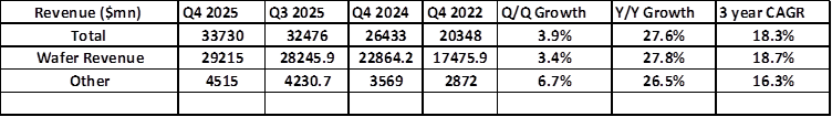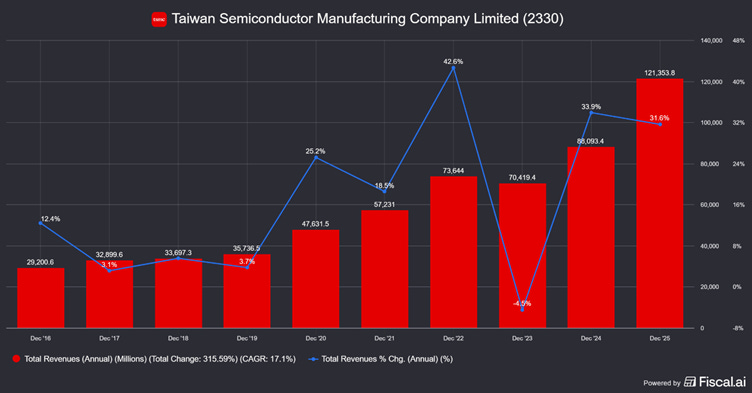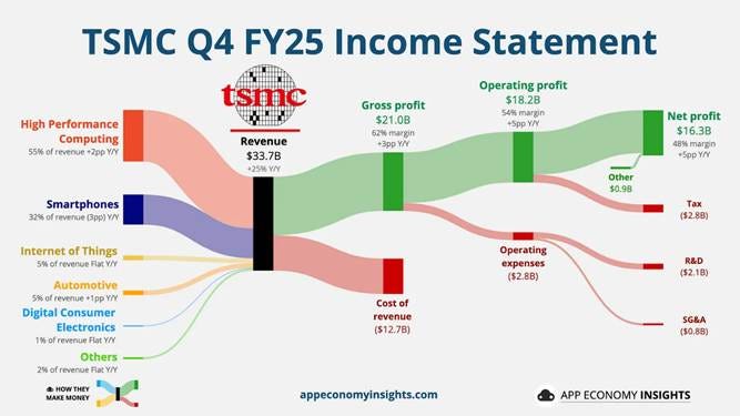 TSMC is in a monopoly supplier position at a time when demand is exploding thanks to the huge investments being made by the cloud hyperscalers such as Microsoft and Amazon as well as other large tech companies such as Meta and Oracle. The scale of the investment in AI datacentres is so large that it accounted for 40% of the growth in US GDP in H2 2025.