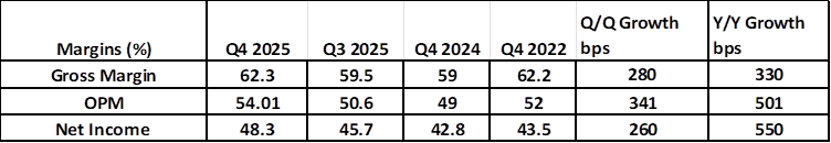 There was an impressive growth in already high margins. Gross margins at 62.3% were 330 bps higher (y/y). The chart below shows the strong ten-year trend in margins. This looks like a secular rise in a industry which is cyclical.