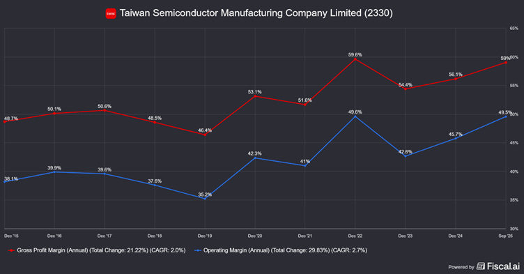 The introduction of the most advanced 2nm technology is further expected to dilute margins as initial yields are lower but improve greatly by year three.