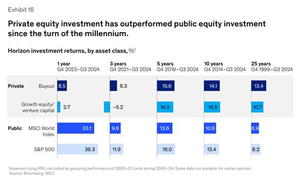 From the McKinsey Report on Private Equity (PE ). PE has underperformed S&P 500 over 1-year, 3-year, and 5-year time horizons.